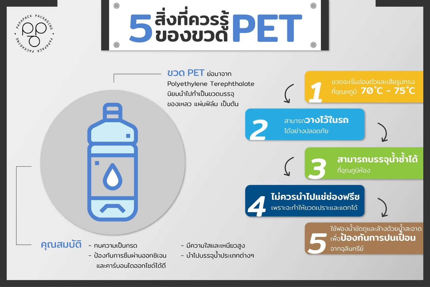 จะเป็นผู้ชายขายน้ำหรือผู้หญิงขายน้ำทั้งที นอกจากจะสนใจเรื่องรสชาติของเครื่องดื่มที่จะขายแล้วต้องสนใจเรื่องของบรรจุภัณฑ์ที่จะใช้ขายด้วยนะ โดยเฉพาะขวด PET หรือขวดน้ำใสขวัญใจมวลมหาชลที่เราพบเจอกันอยู่ทุกๆ วัน เชื่อว่าหลายคนยังไม่ทราบว่าจริงๆ แล้วแล้วขวด PET นั้นมีคุณสมบัติและวิธีการใช้ยังไง วันนี้ PAPAPACK จะพาทุกคนไปรู้จักขวด PET กัน ขวด PET ย่อมาจาก Polyethylene Terephthalate นิยมนำไปทำเป็นขวดบรรจุของเหลว แผ่นฟิล์ม เป็นต้น คุณสมบัติ – ทนความเป็นกรด– มีความใสและเหนียวสูง– ป้องกันการซึมผ่านออกซิเจนและคาร์บอนไดออกไซด์ได้ดี– นำไปบรรจุน้ำประเภทต่างๆ วิธีการใช้ที่ถูกต้อง1.ขวดจะเริ่มอ่อนตัวและเสียรูปทรงที่อุณหภูมิ 70°C – 75°C2.วางไว้บนรถได้อย่างปลอดภัย3.สามารถบรรจุน้ำซ้ำได้ที่อุณหภูมิห้อง4.ไม่ควรนำไปแช่ช่องฟรีซเพราะจะทำให้ขวดเปราะและแตกได้5.ใช้ฟองน้ำแบบนิ่มขัดถูและล้างด้วยน้ำสะอาด เพื่อป้องกันการปนเปื้อนจากจุลินทรีย์ PAPAPACK WEBSITELine@: @papapackFacebook: PapapackInstagram: papapack